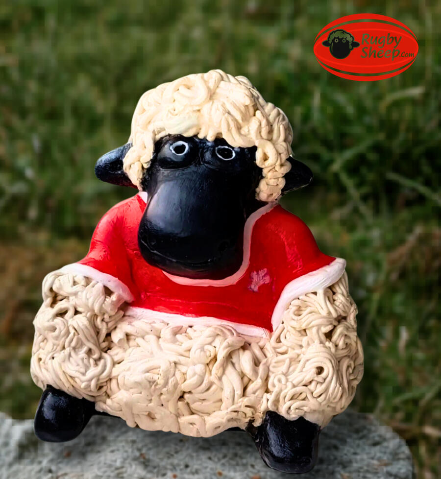 Novelty ceramic rugby sheep, individually hand-made in Wales. Can be custom designed with your team number, surname, club colours or in the Welsh rugby jersey.